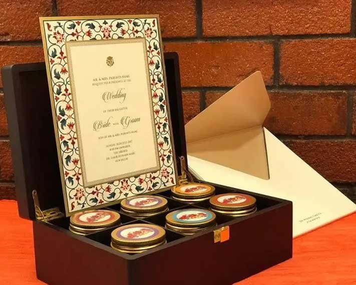 In this idea, you can make a box of 2 to 4 big and expensive laddos or any other sweet. So, along with an invitation card, you can send a small box of gifts to the guests. And this personalized wedding invitation gift item will make your guest feel special.